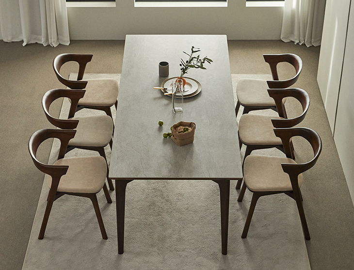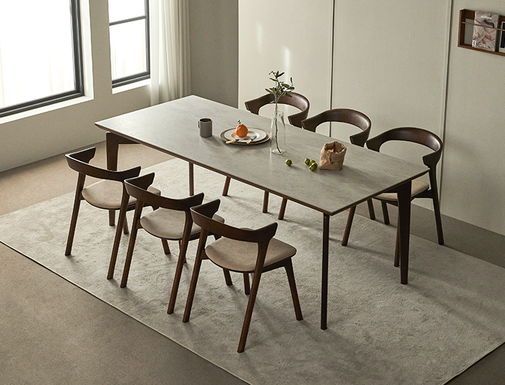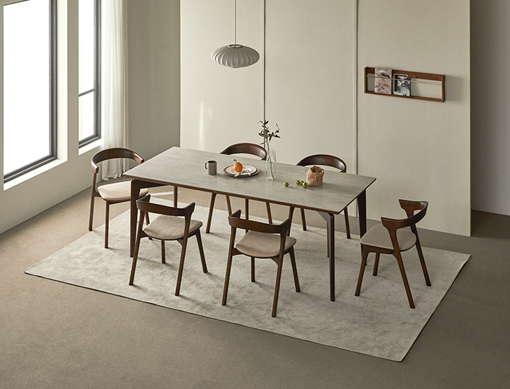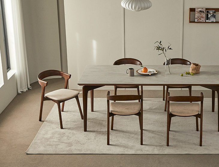 식탁크기에 상관없이 가격이 일정하기에 욕심을 내고 싶었지만 현재 6인용 식탁크기에서 10cm 만 크게 제작하여 구매했습니다. 5인 가족이라 의자는 5개만 구입하였고 의자 색상은 쇼파와 쿠션 색상으로 맞췄습니다.